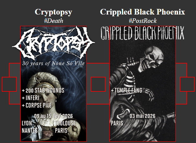 Un mois d'avril avec pas moins de 12 tournées, voilà qui devrait permettre de satisfaire vos goûts électriques et parfois éclectiques. vous proposer quelques nouveaux noms, à découvrir absolument : Crypta sous le nom "Nakkeknaekker", vient défendre son premier album de death groovy « Viscera » - "prêts à conquérir les amateurs d’Obituary ou encore de Decapitated. On tient là potentiellement the next big thing" -eklektik- commence juste à se faire un nom sur notre territoire ; pour qui aime le hard, les hits, les voix éraillées - "l’album est si authentique qu’il en devient une parenthèse musicale de 38 minutes de pur plaisir" -Loud TV- |